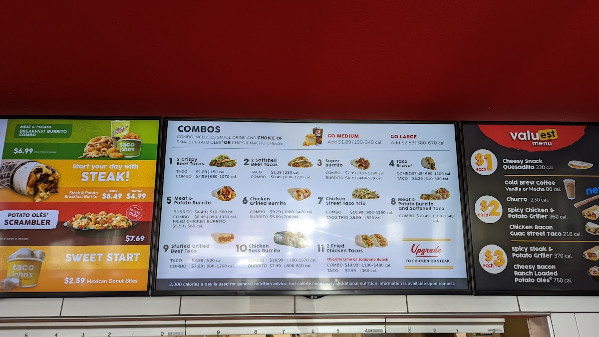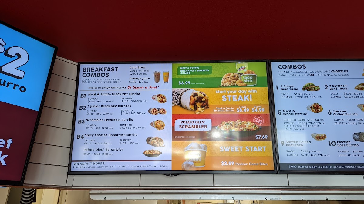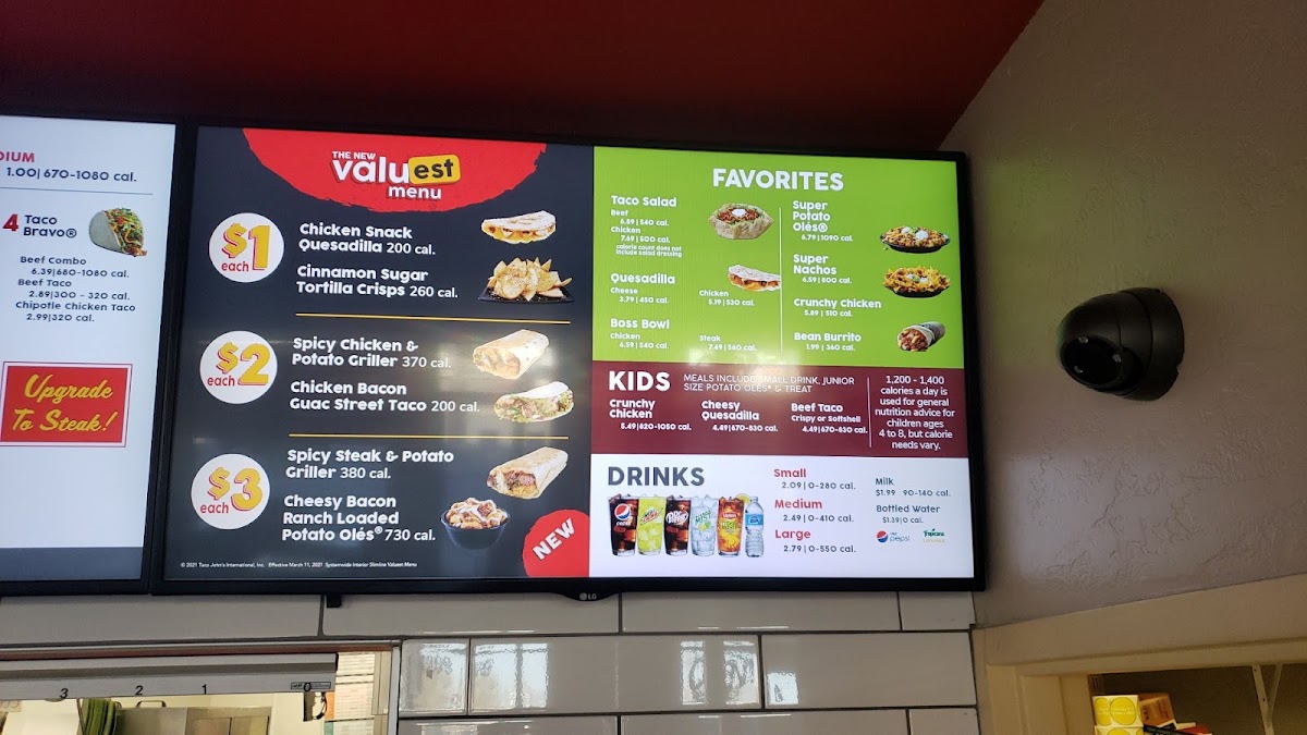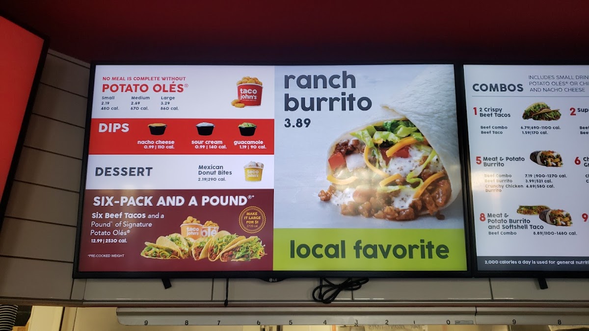 Kids are well catered for, with choices like Cheesy Quesadillas, Chicken Tenders, and Softshell Tacos, each served alongside junior-sized Potato Olés® and drinks, making family outings seamless. Consistently praised for fresh ingredients, generous portions, and warm customer service, Taco John's strikes the perfect balance between comfort and flavor in fast casual Mexican dining. The cozy atmosphere enhances the overall experience, making every visit welcoming and satisfying.